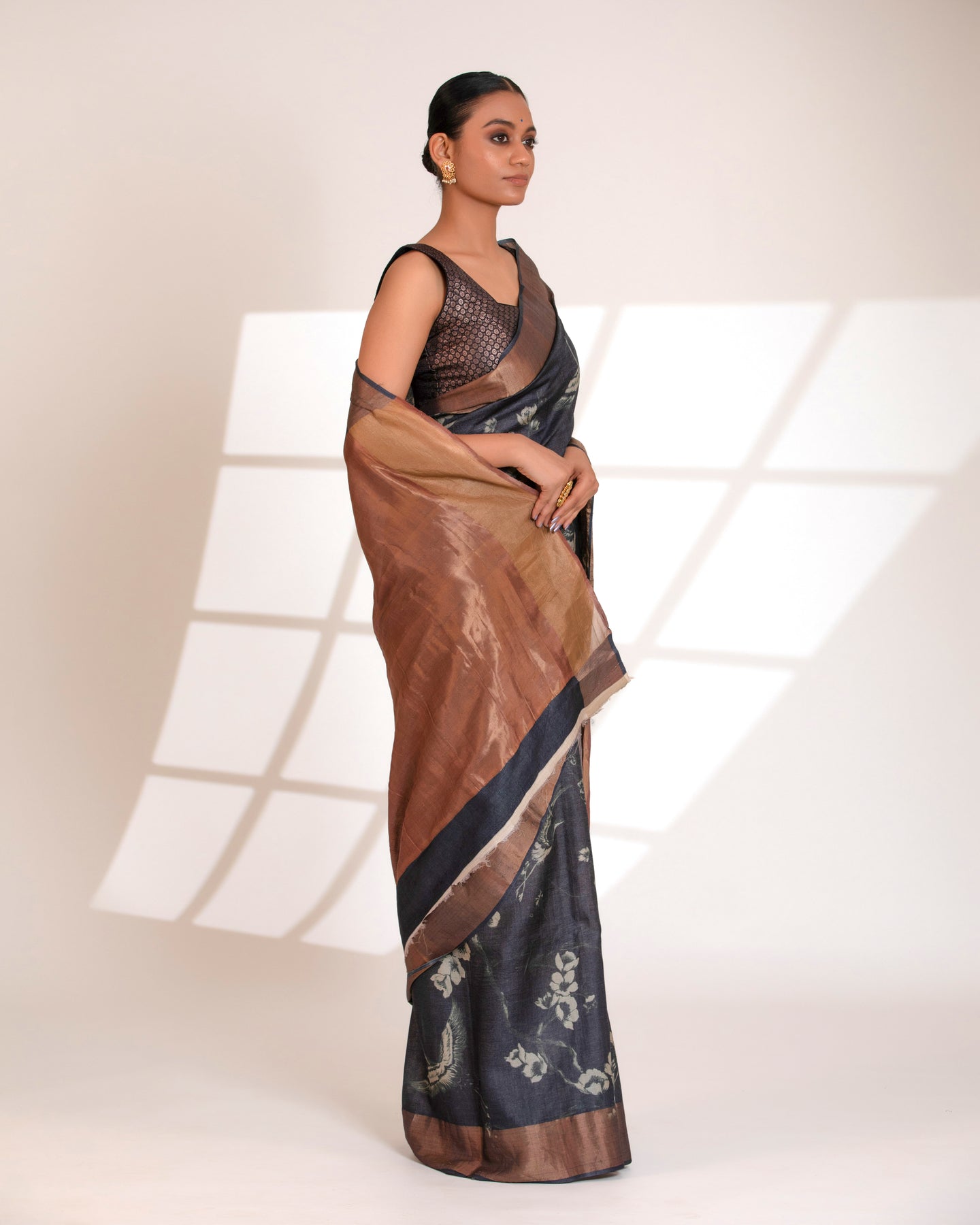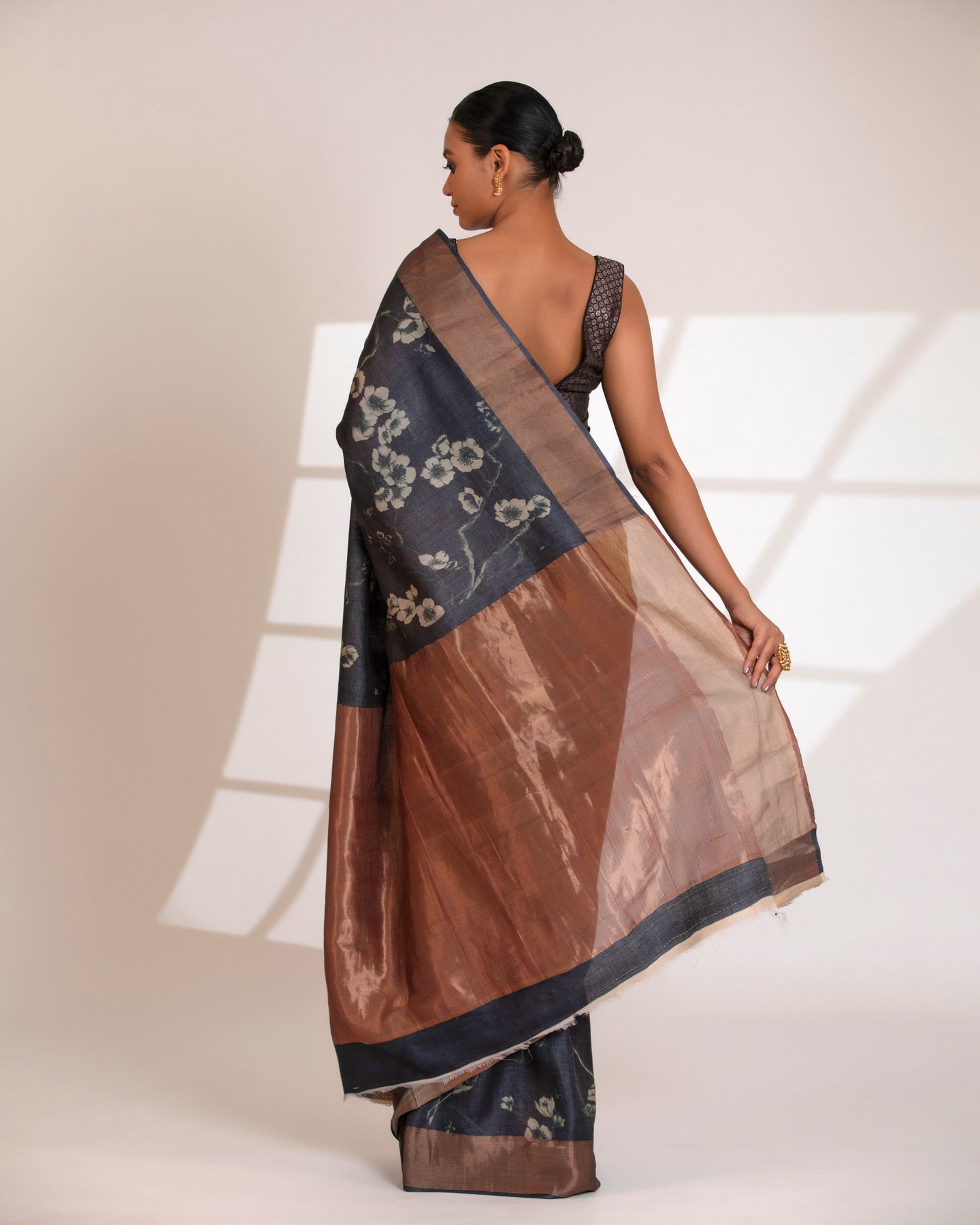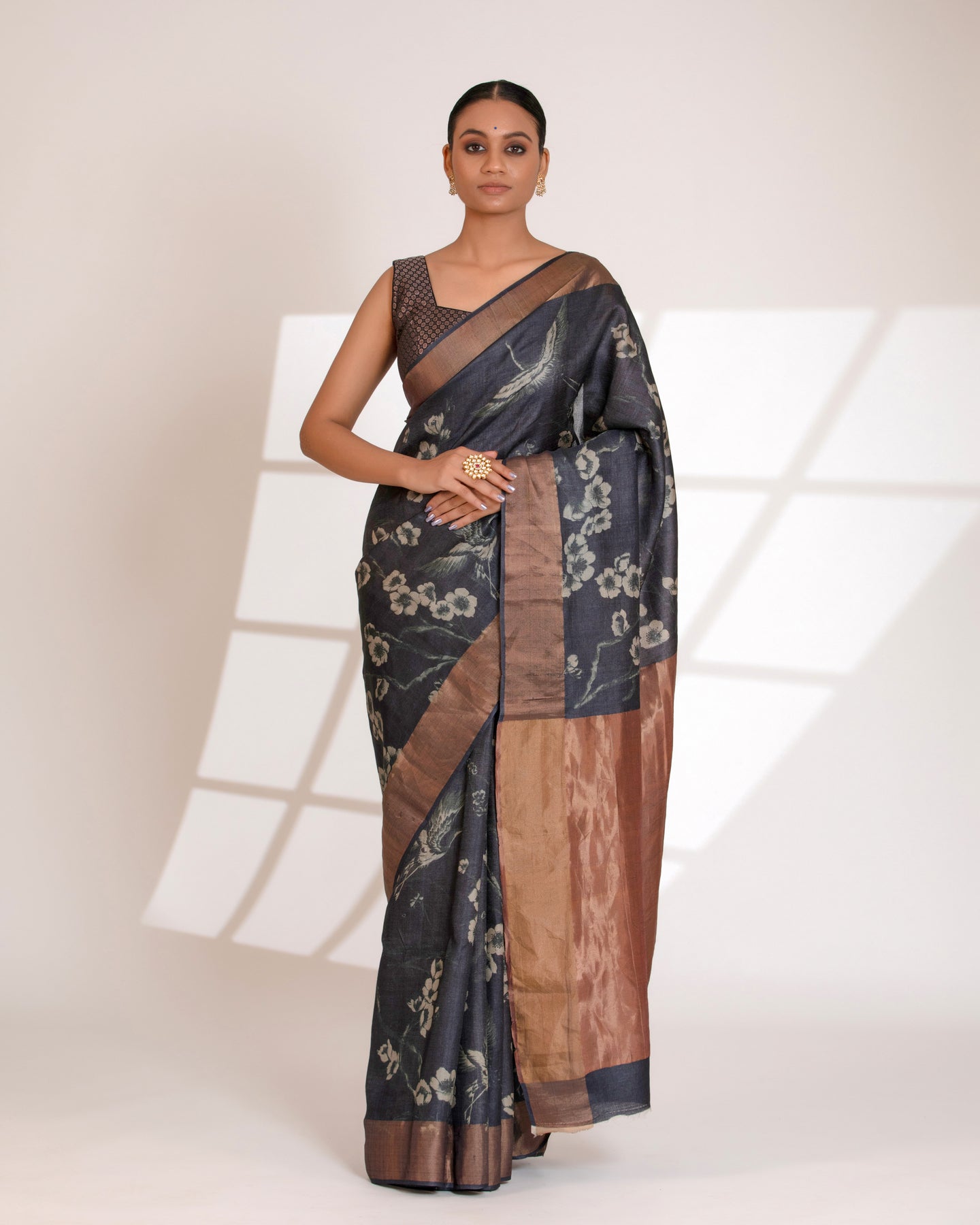 Regular price Rs. 9,975.00Elevate your wardrobe with this charcoal grey Tussar Silk Saree, beautifully designed with a soft digital floral print that adds grace and femininity to the drape. The saree is paired with a bronze-gold tissue pallu, offering a luxurious sheen and elegant contrast to the muted body color.