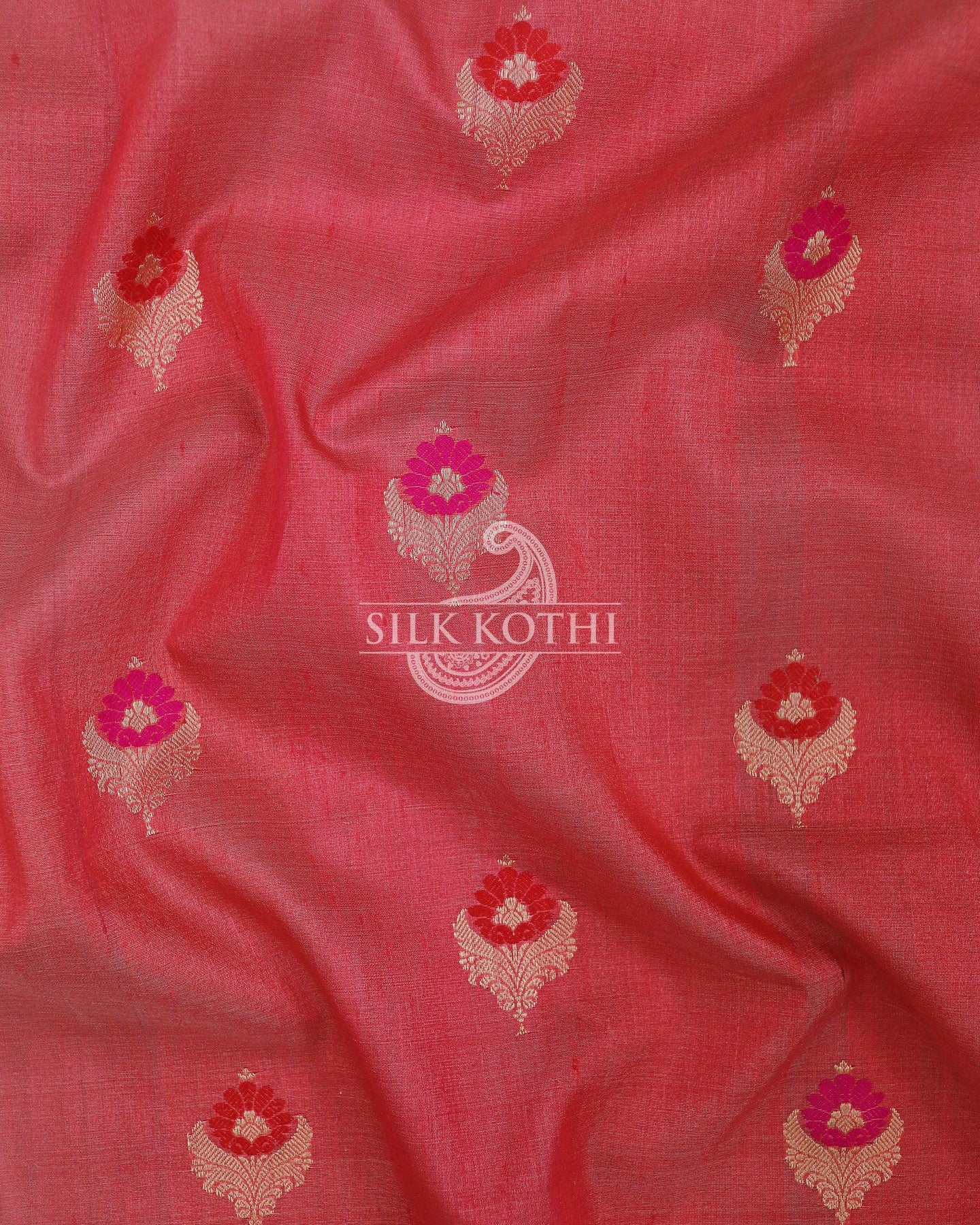 Regular price Rs. 47,985.00This Onion Pink kadhwa jangla meenakari katan silk is a perfect blend of beauty, precision, and grandeur of handloom craftsmanship. The affluent onion pink is embossed with the age-old technique of kadhwa weaving and overlayed floral meenakari work in a jangla pattern. The glamorous blooming floral self-border adds charm to this elegant piece. It is sure to affix a spellbound and magical vibe to your attire.