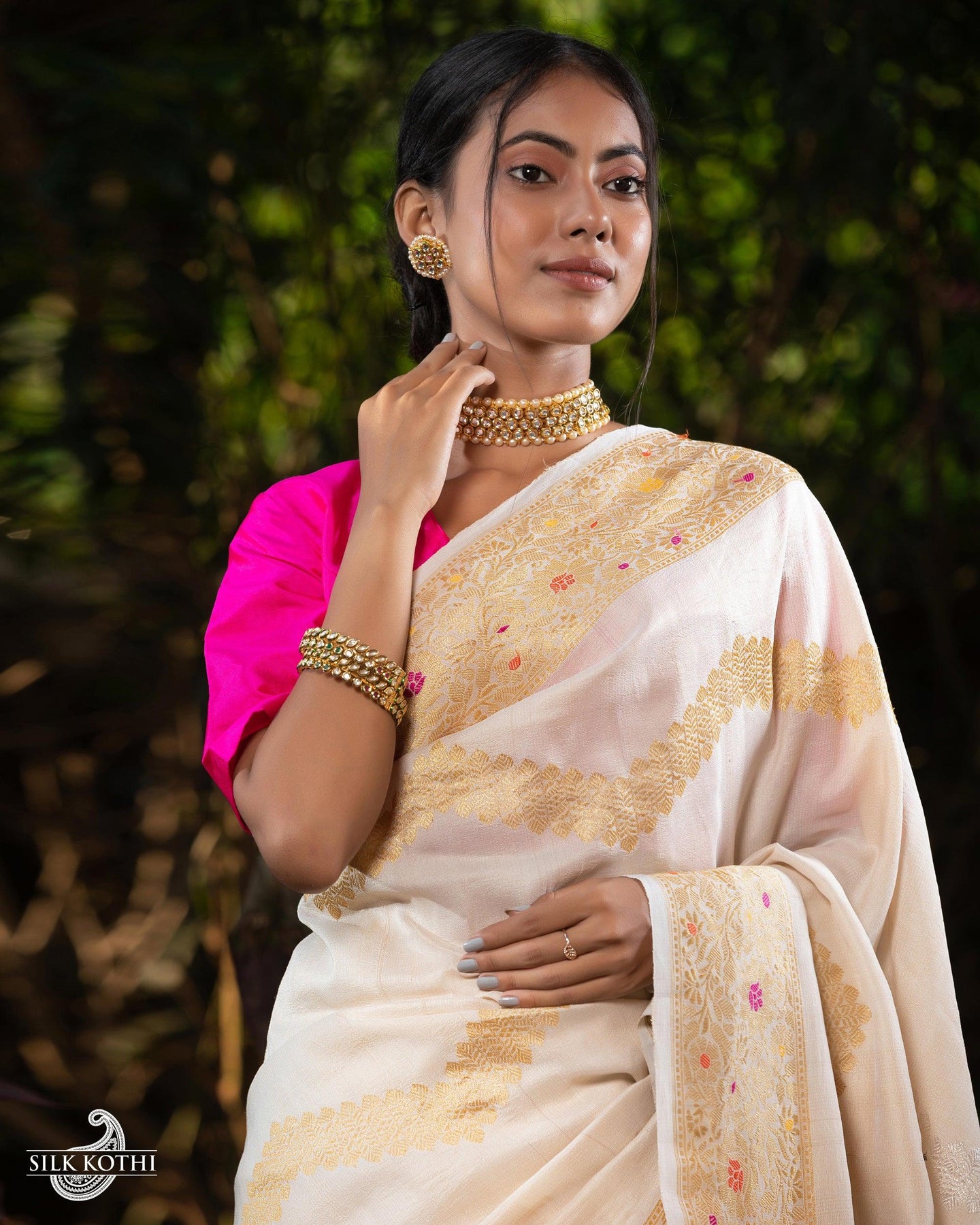 IVORY CREAM KADHWA MEENA BORDER TUSSAR GEORGETTE BANARASI HANDLOOM SAREE