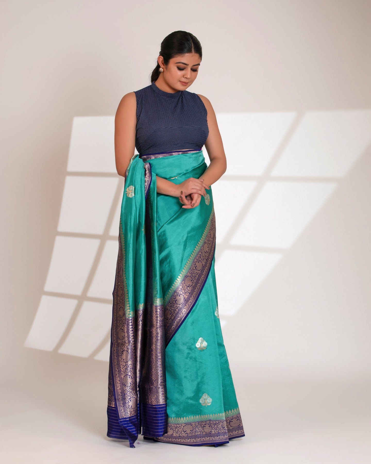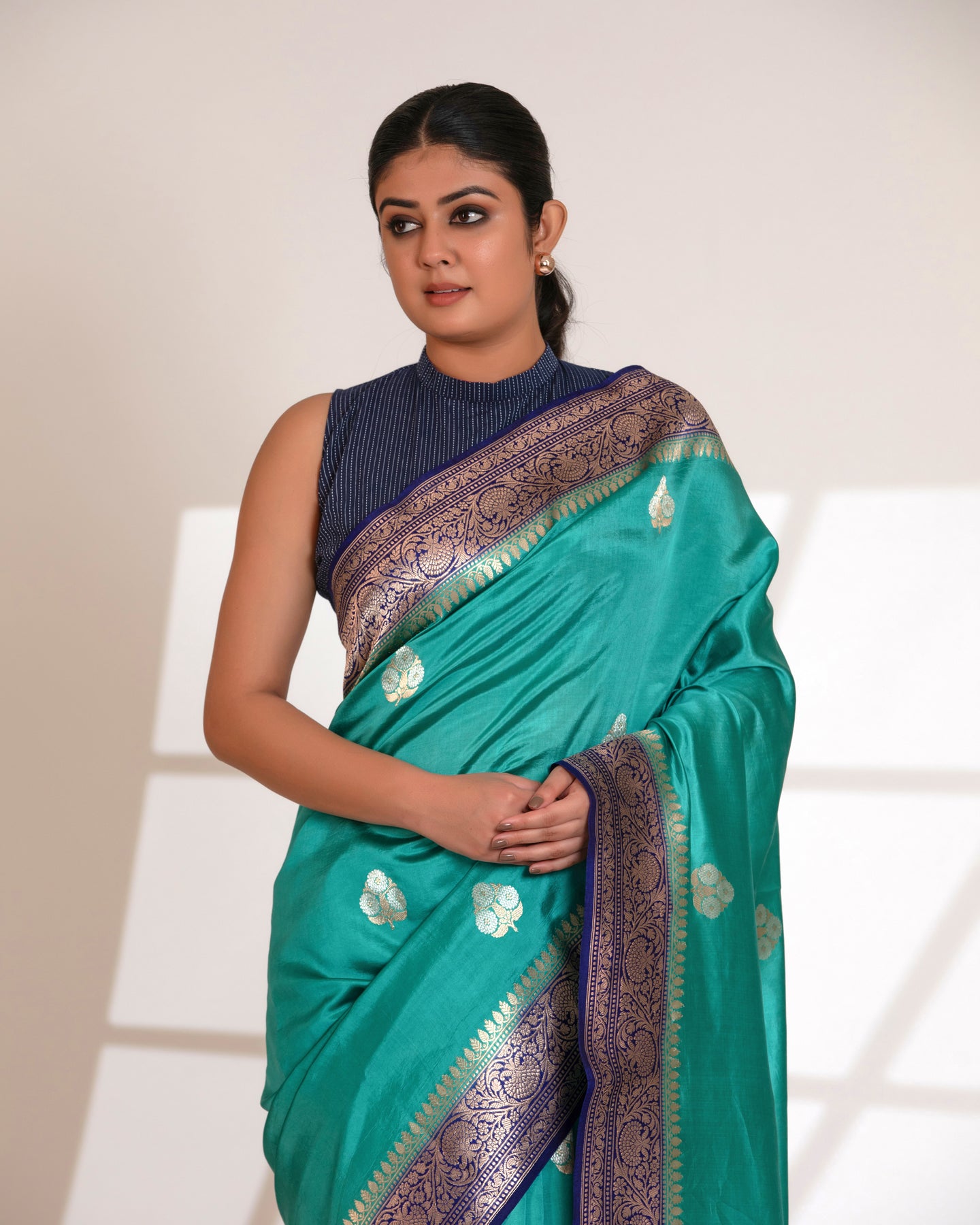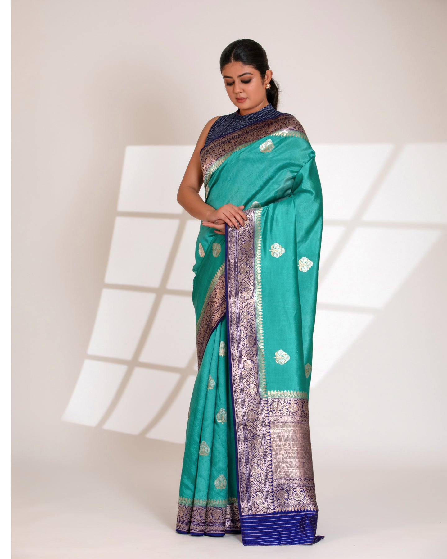 TURQUOISE BLUE RUPASONA UPPADA SAREE WITH INTRICATE GOLD FLORAL JAAL WEAVING – PREMIUM HANDLOOM ELEGANCE | Banarasi Handloom Saree
