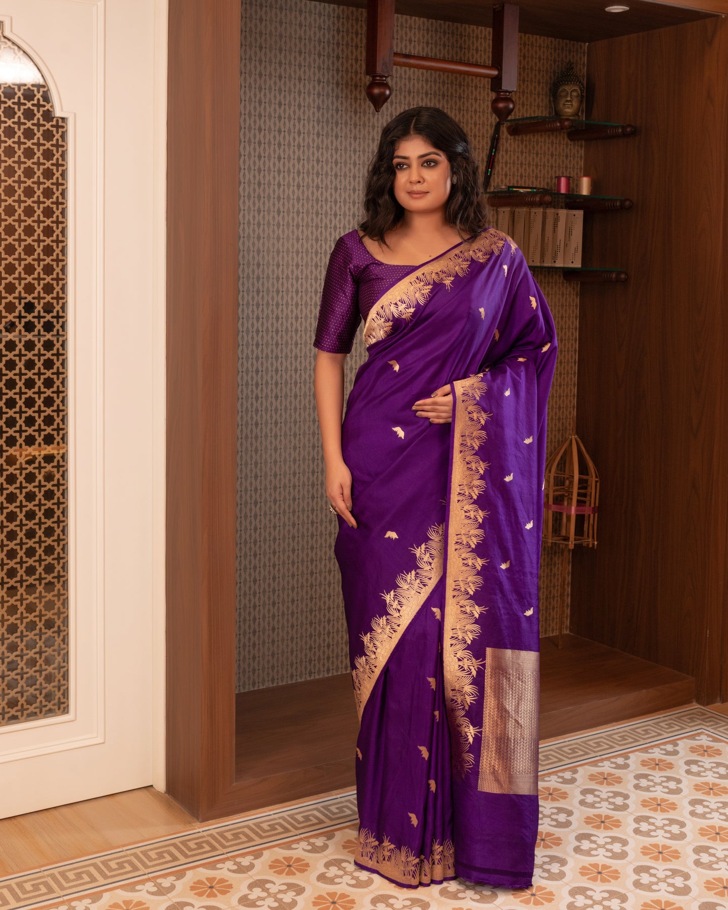 When delicate silk yarns get mingled with exquisite designs and vibrant colors on the canvas of handloom, the illation is a luxe beauty. Here’s a luxurious designer Banarasi Puna Silk Saree in Luxury Violet Color. This saree has artistic blooming butas, which embody a captivating border. The color and design wrap this saree into a refined garment. Moreover, Raw Mango is a perfect choice for your spellbound look on any occasion.
