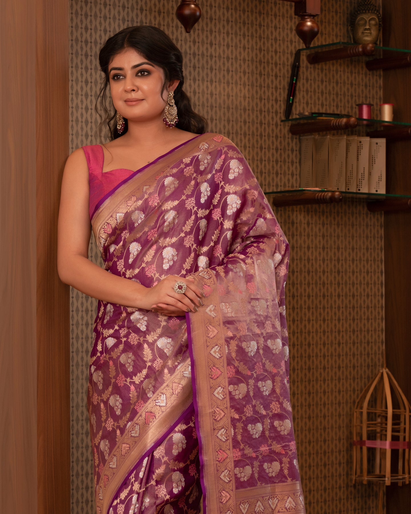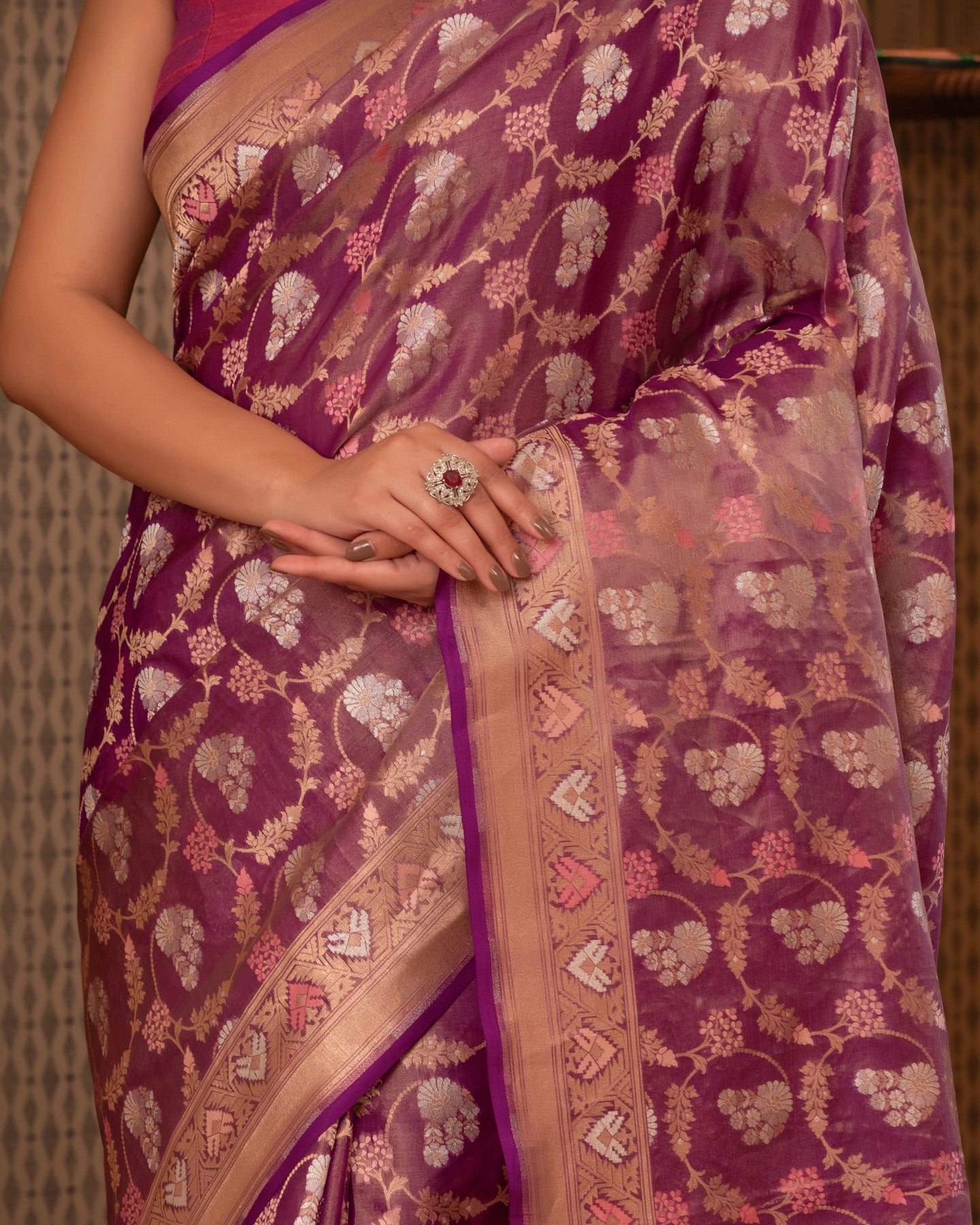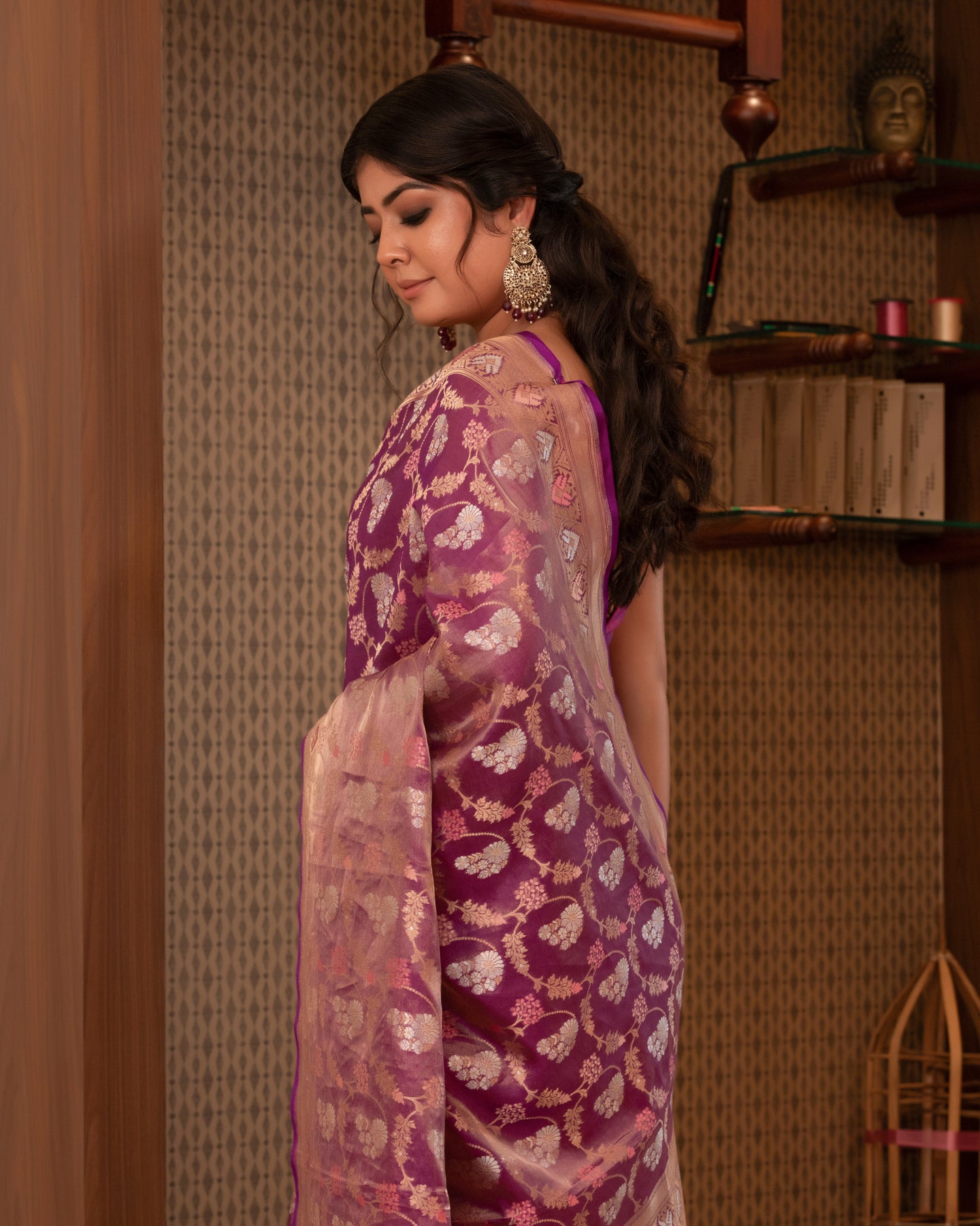 PURPLE TISSUE RUPASONA JAAL SAREE WITH INTRICATE FLORAL ZARI WEAVE – PREMIUM BANARASI HANDLOOM SAREE