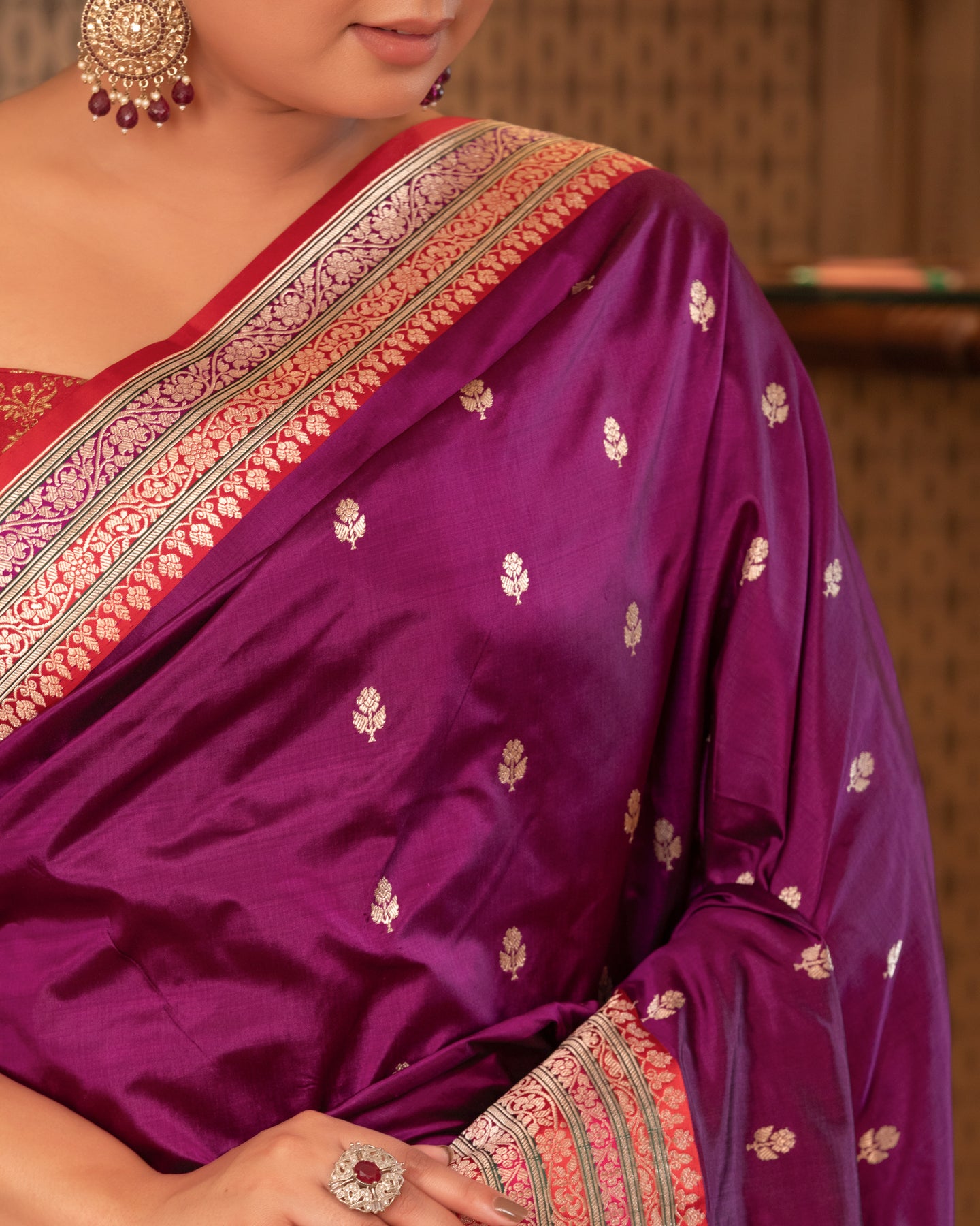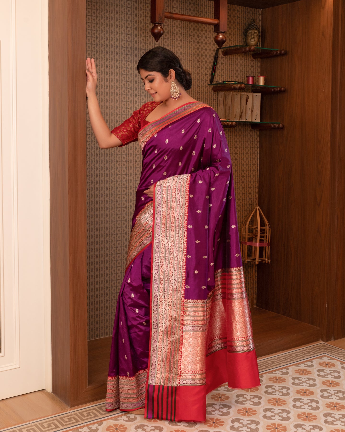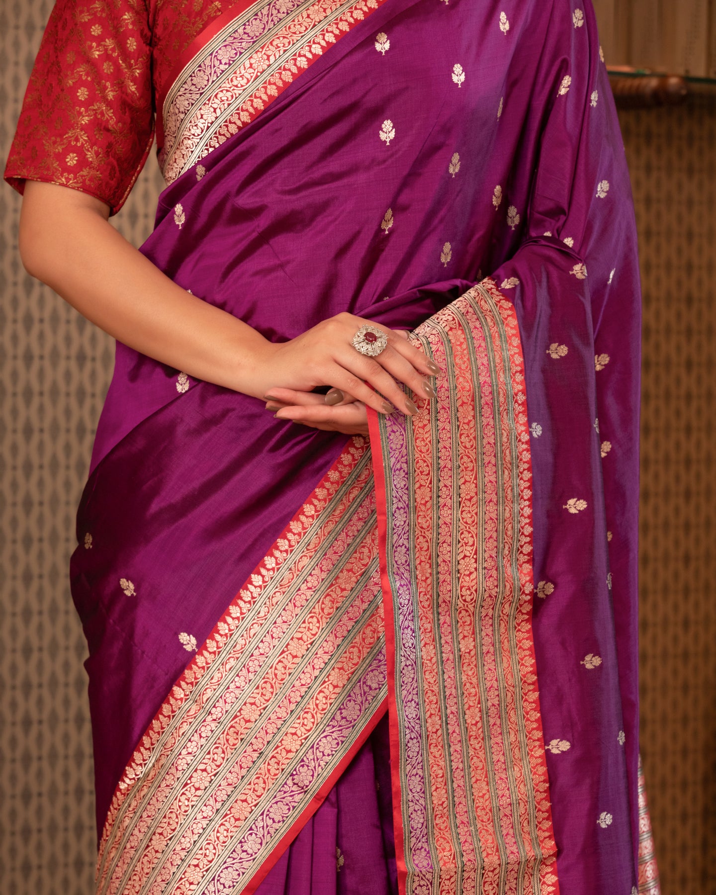 PURPLE KATAN SILK BUTI SAREE WITH MULTI BORDER – BANARASI HANDLOOM