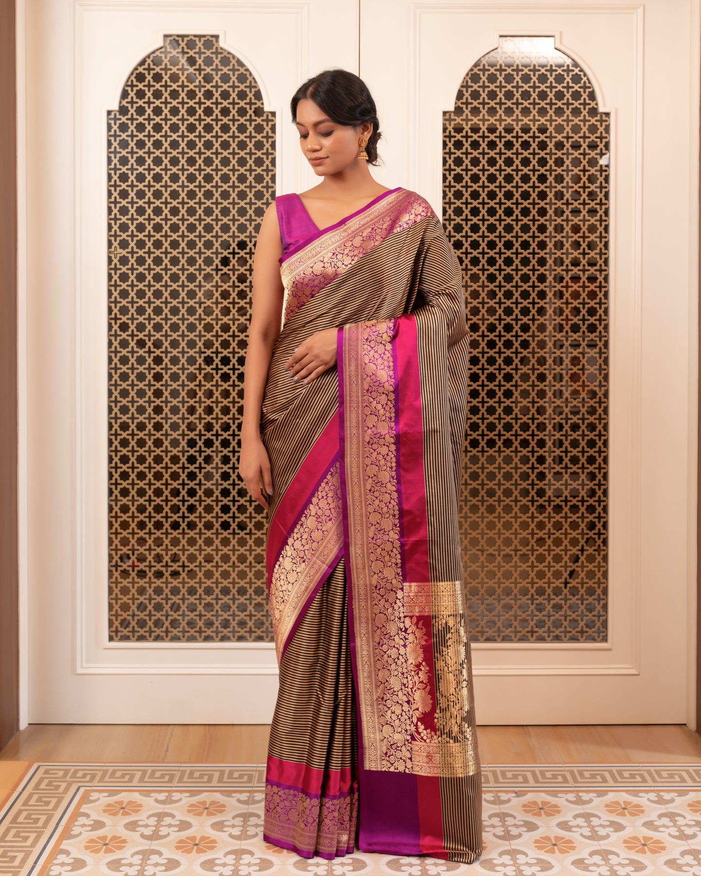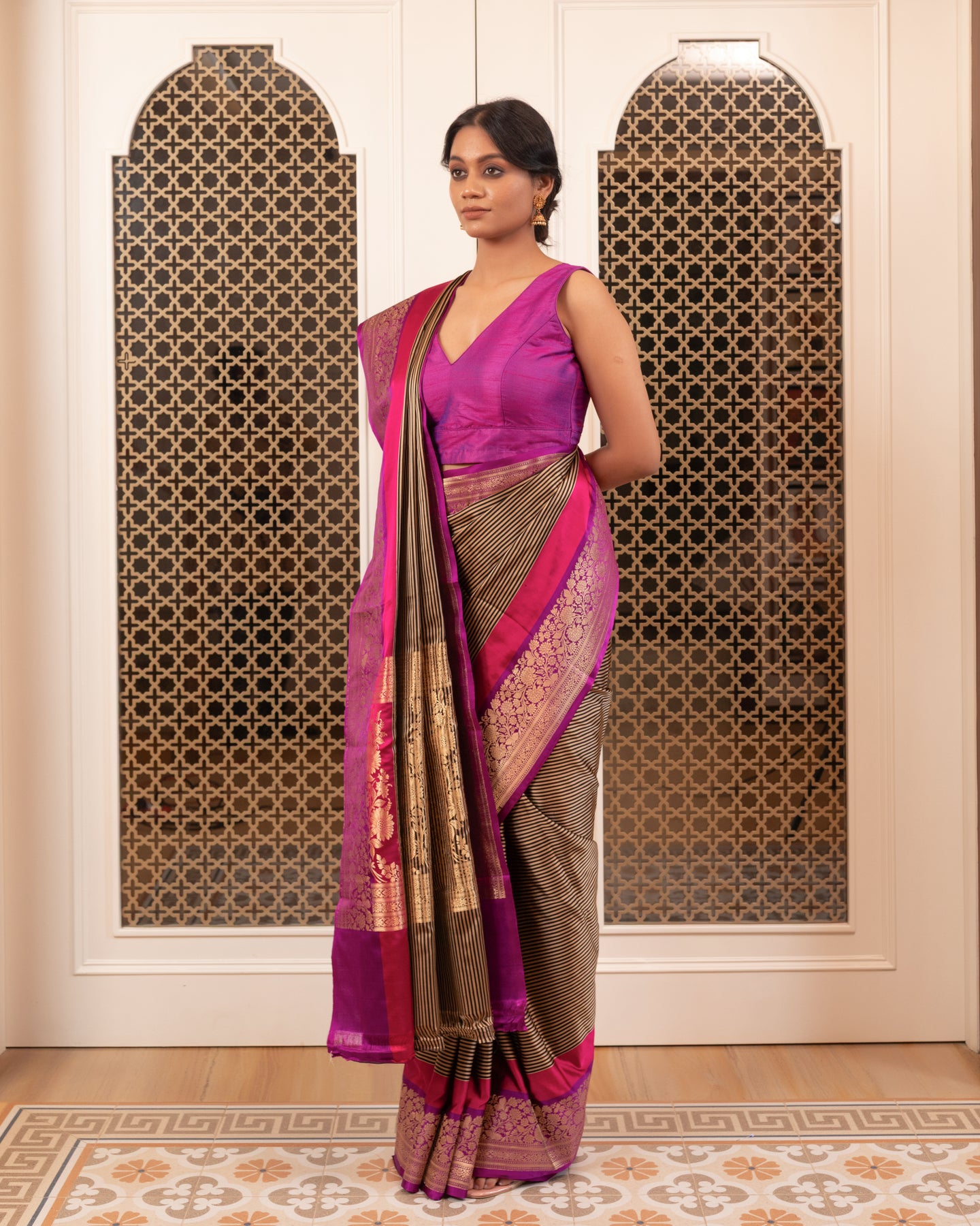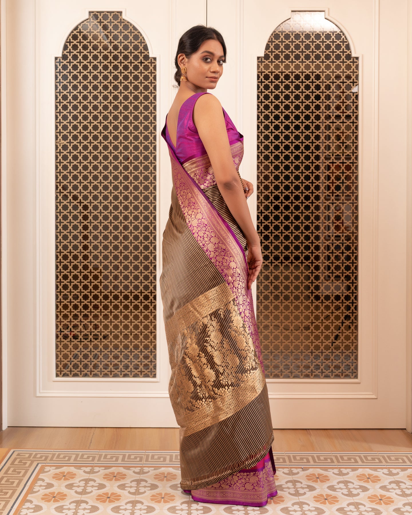 Elevate your festive elegance with this Purple Mashru Katan Stripes Saree, crafted in a luxurious 750gm heavy weave. The body features classic black–cream Mashru stripes, beautifully contrasted with a rich purple and magenta panel. A stunning gold zari floral border completes its timeless Banarasi charm.