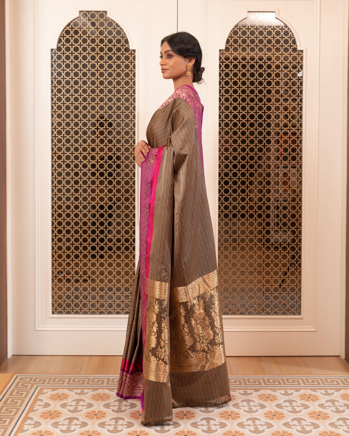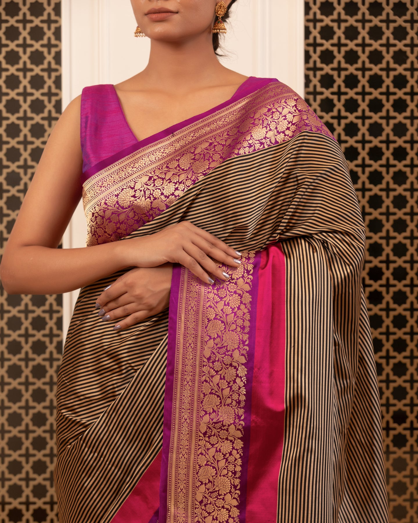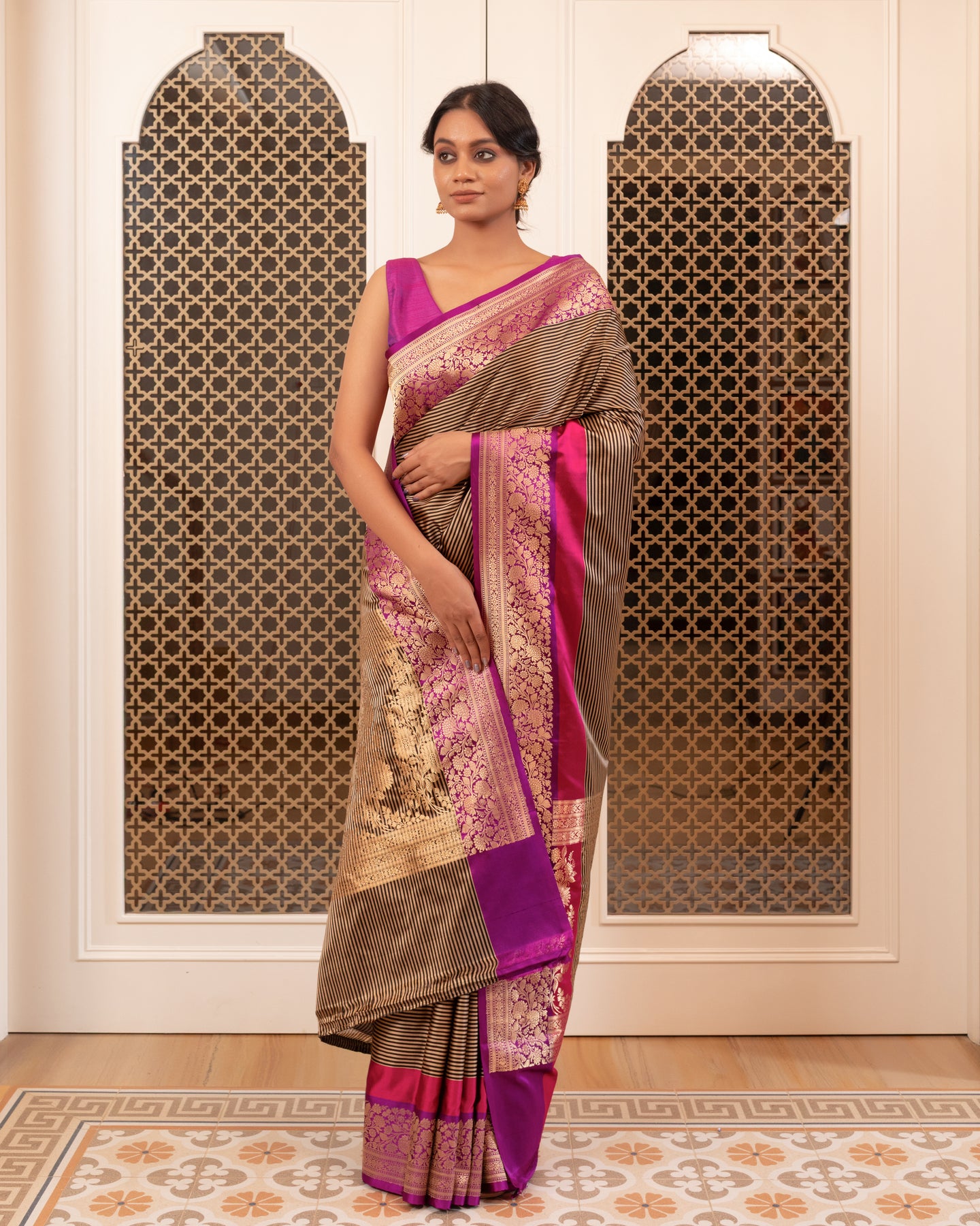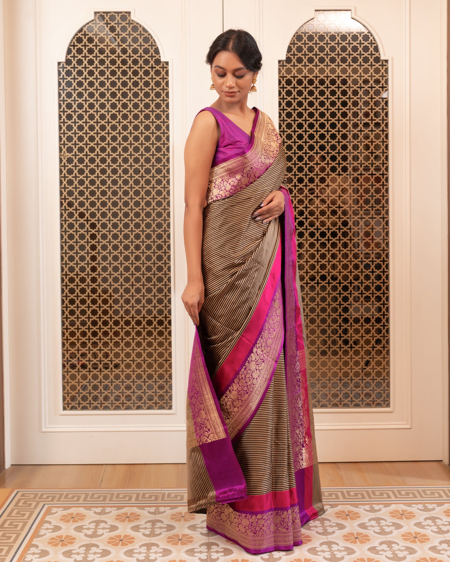 PURPLE MASHRU KATAN STRIPES SAREE – BANARASI WEAVE WITH ZARI FLORAL BORDER | BANARASI HANDLOOM VARANASI