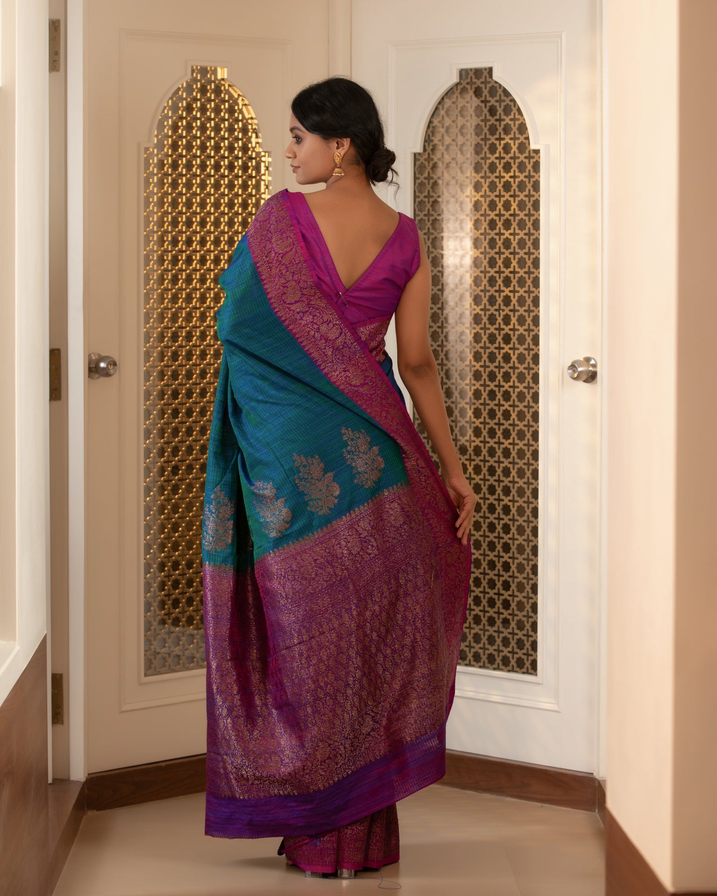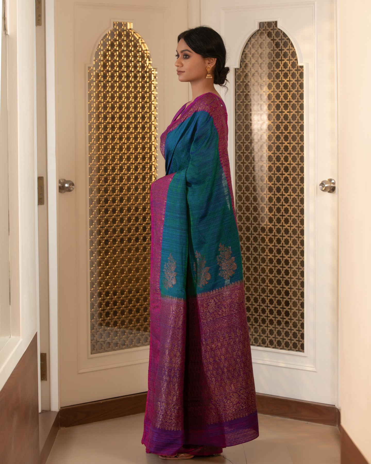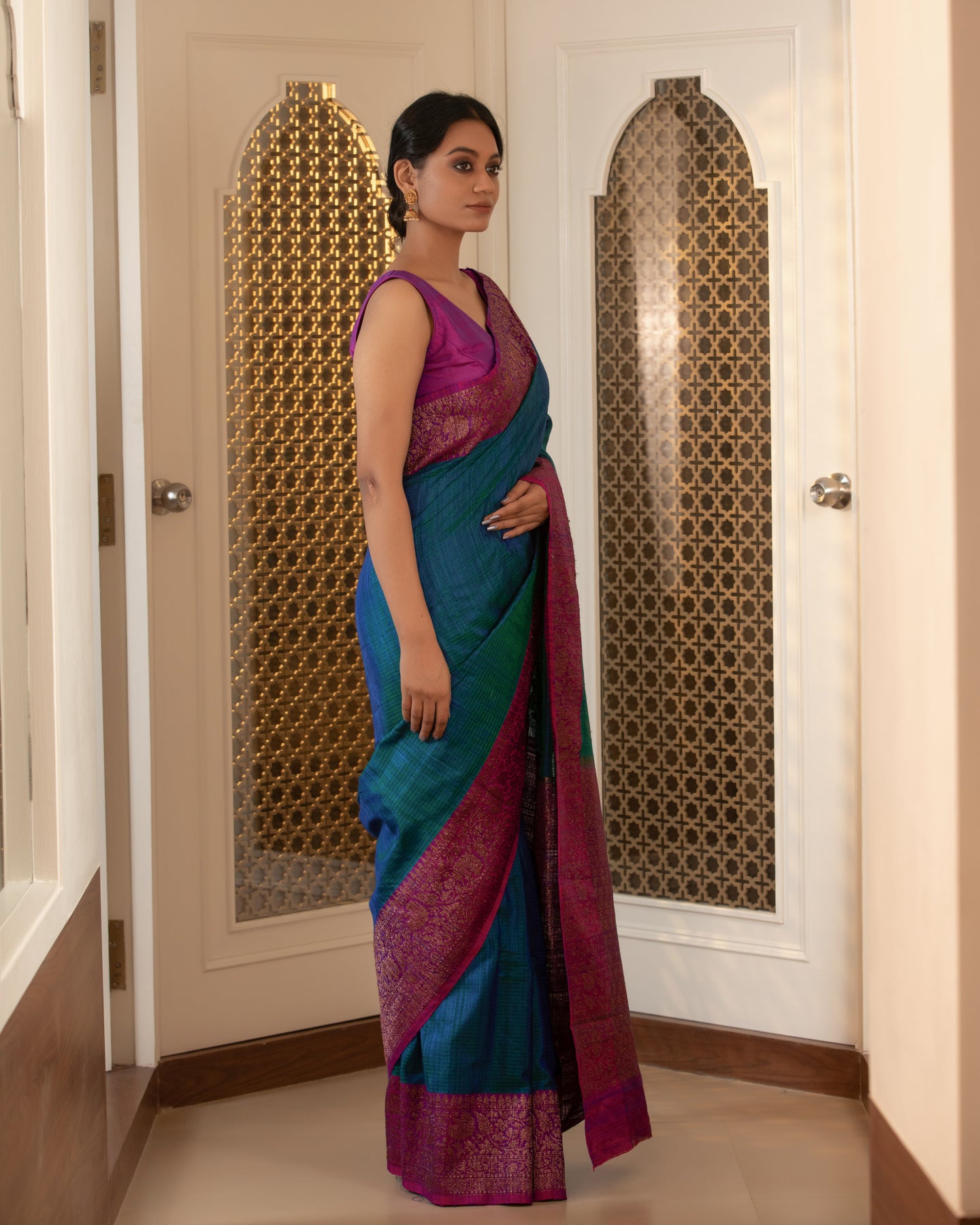 Banarasi Handloom Sarees are an epitome of timeless elegance and craftsmanship, it is a symbol of tradition. This luxurious Purplish Blue kadhwa meenakari border katan silk saree is a harmonious blend of age old tradition of kadhwa weaving technique with modern patterns, making it a perfect choice for special occasions and events. Each folds tells a story, echoing the rich tapestry of Indian craftsmanship, in its meena work.