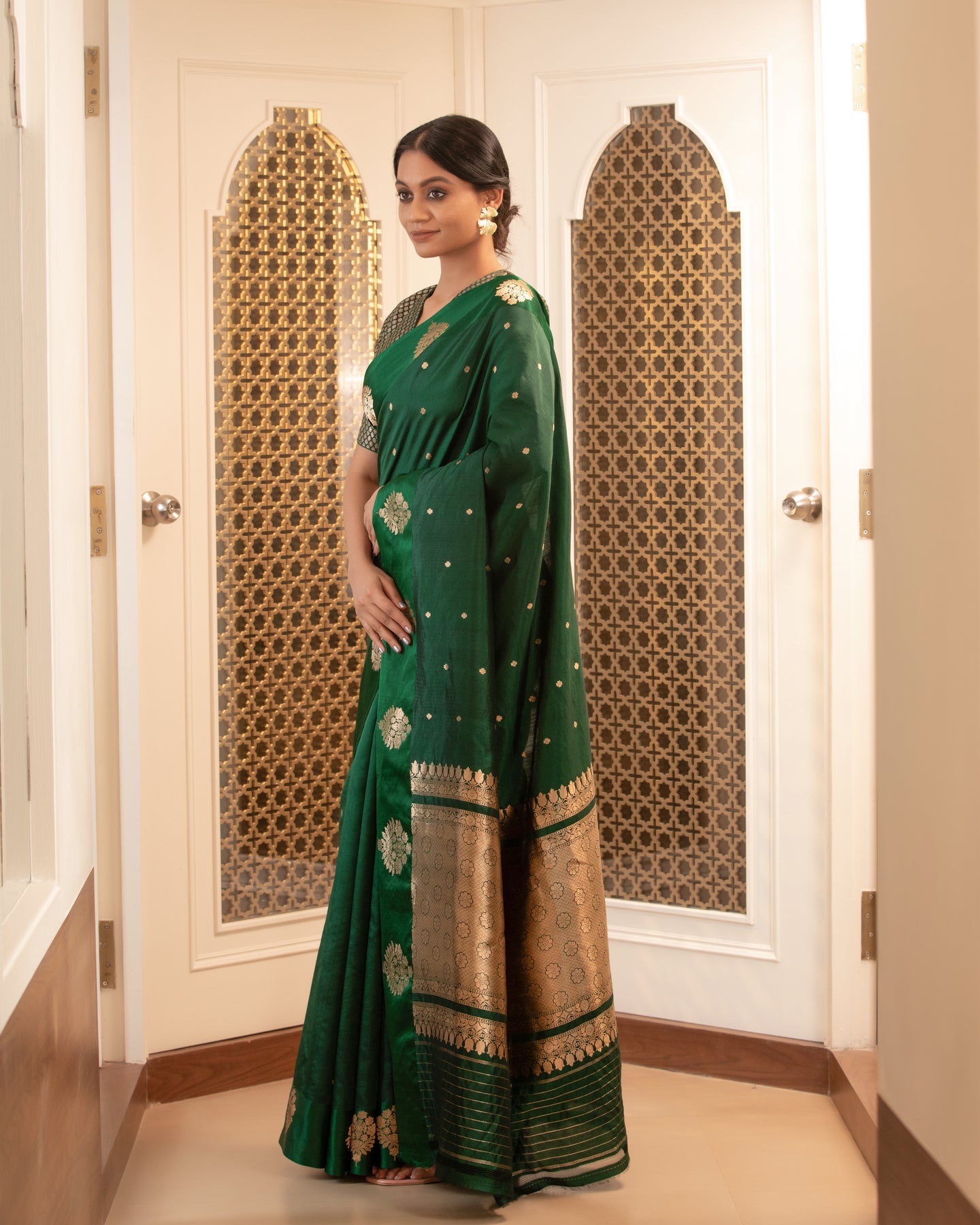 Handloom Silk Sarees are refined elegance that takes us back to a bygone era when the art of hands was celebrated. This Pine Green Katan Banarasi saree weaved through the intricate Kadhwa technique is a luxurious piece of handwoven craft. This evergreen designer comes with zari butas and has an admirably finished contrast border. Besides its aesthetic appeal, katan silk is the true epitome of luxury and finesse, so wear this elegant piece with royalty.