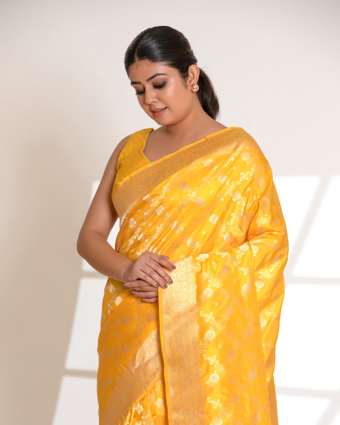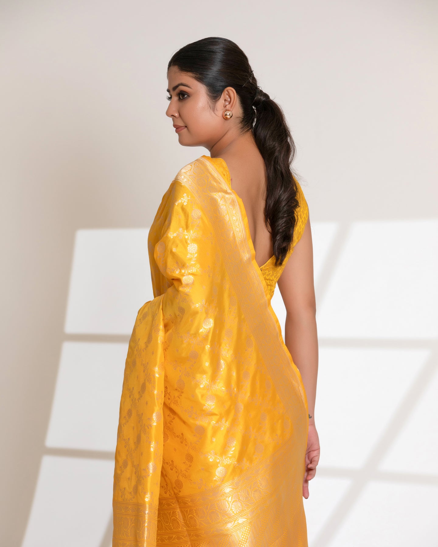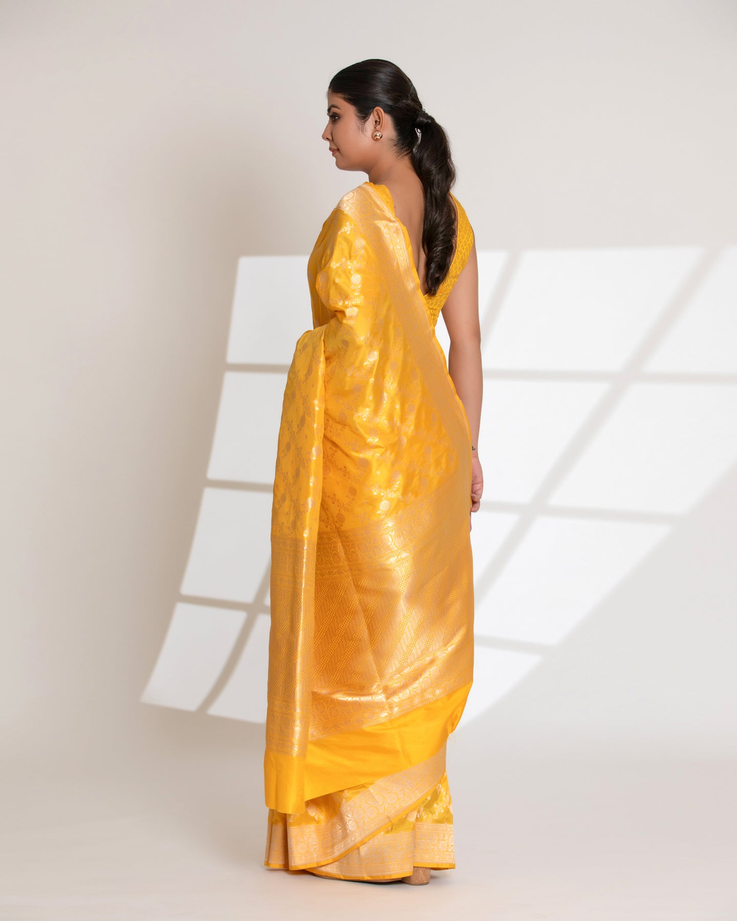 YELLOW SADA UPPADA SILK SAREE WITH GOLDEN ZARI FLORAL JAAL WEAVING – PREMIUM TRADITIONAL BANARASI HANDLOOM SAREE-INSPIRED FESTIVE