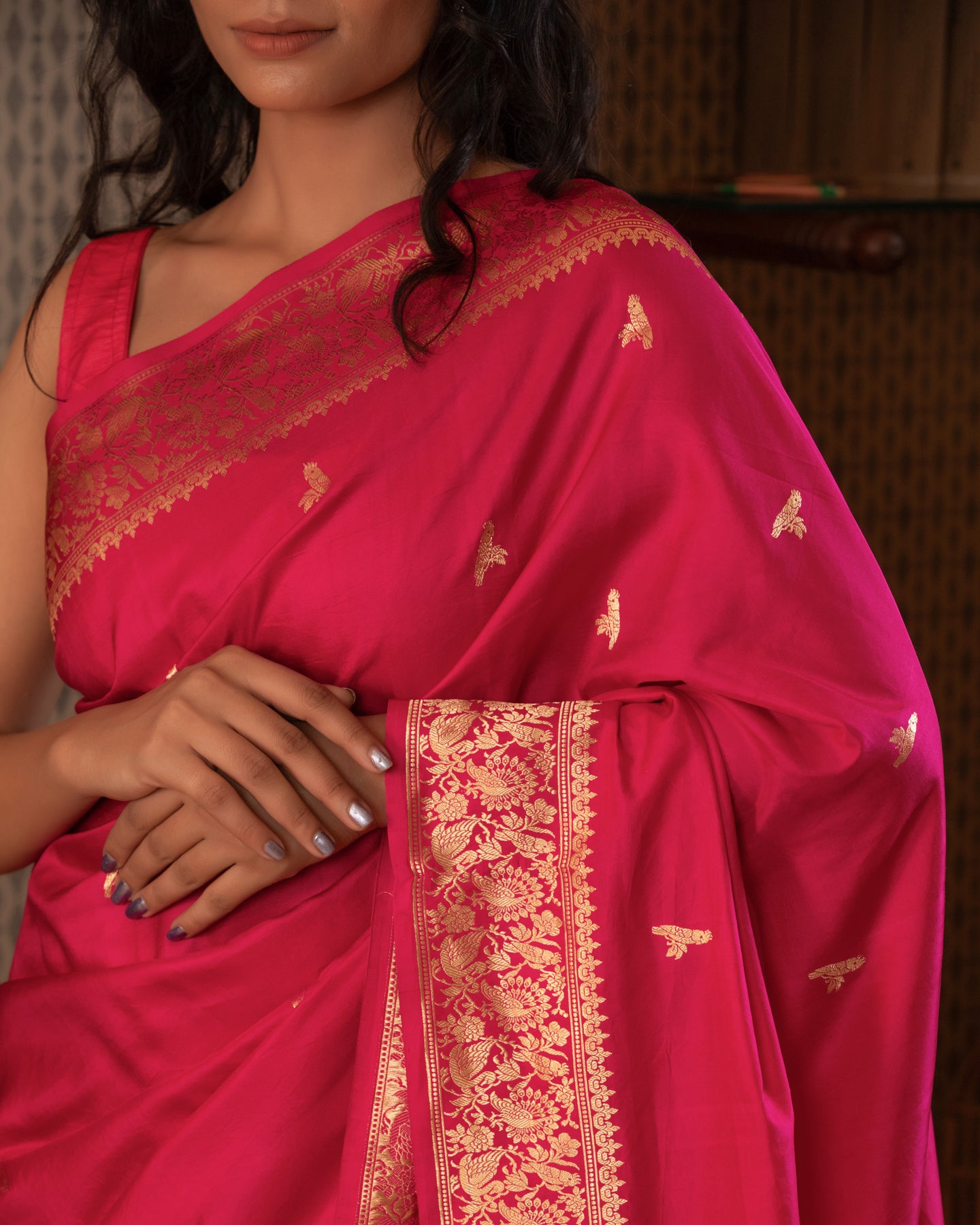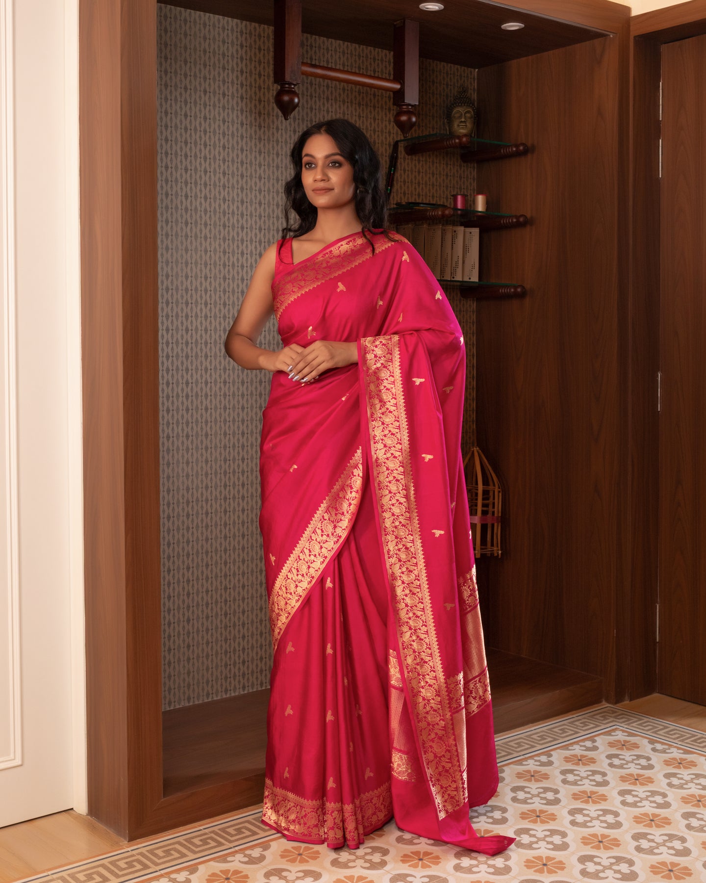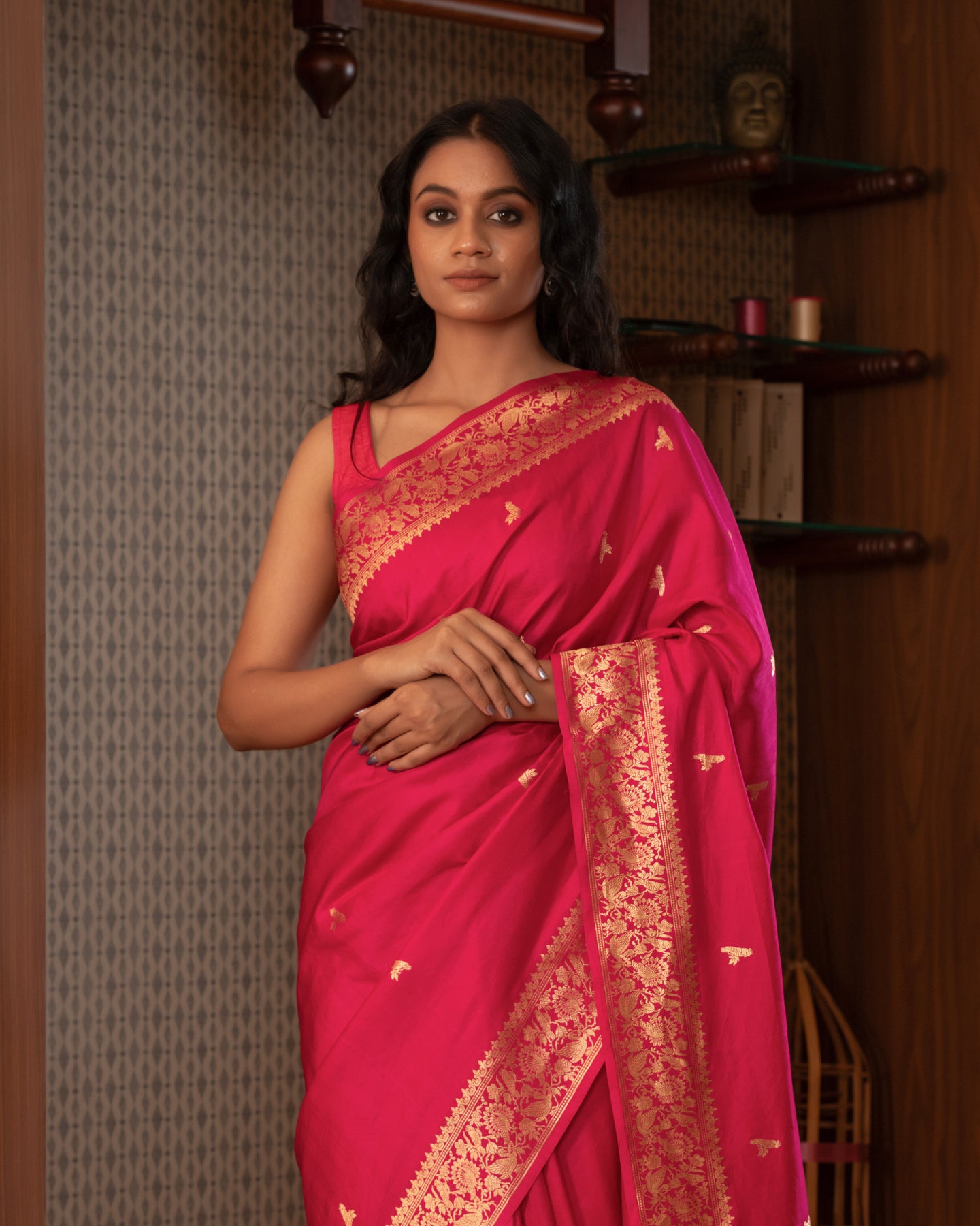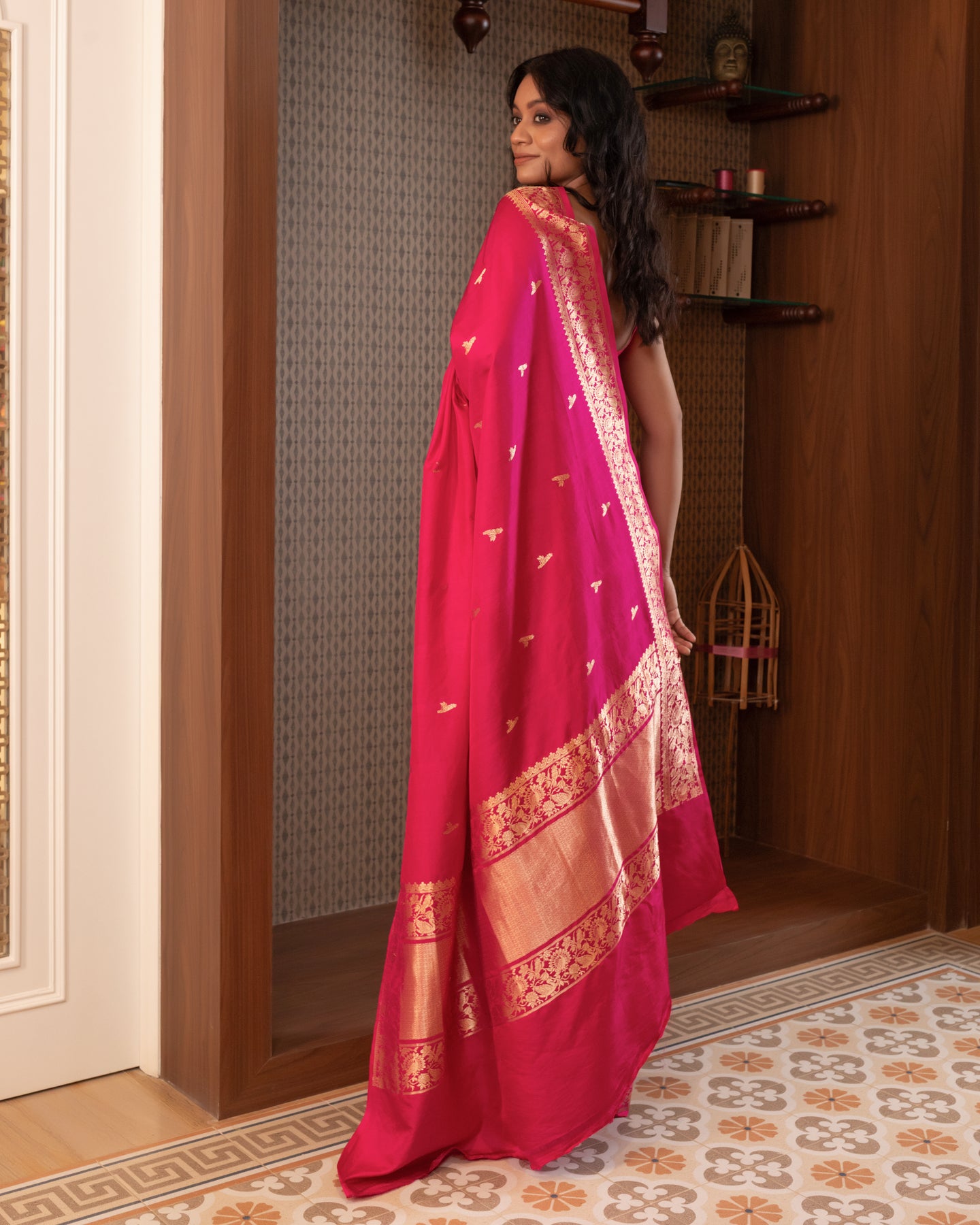 RANI PINK MASHRU SILK SAREE WITH GOLD BUTI BORDER – PREMIUM BANARASI HANDLOOM SAREE