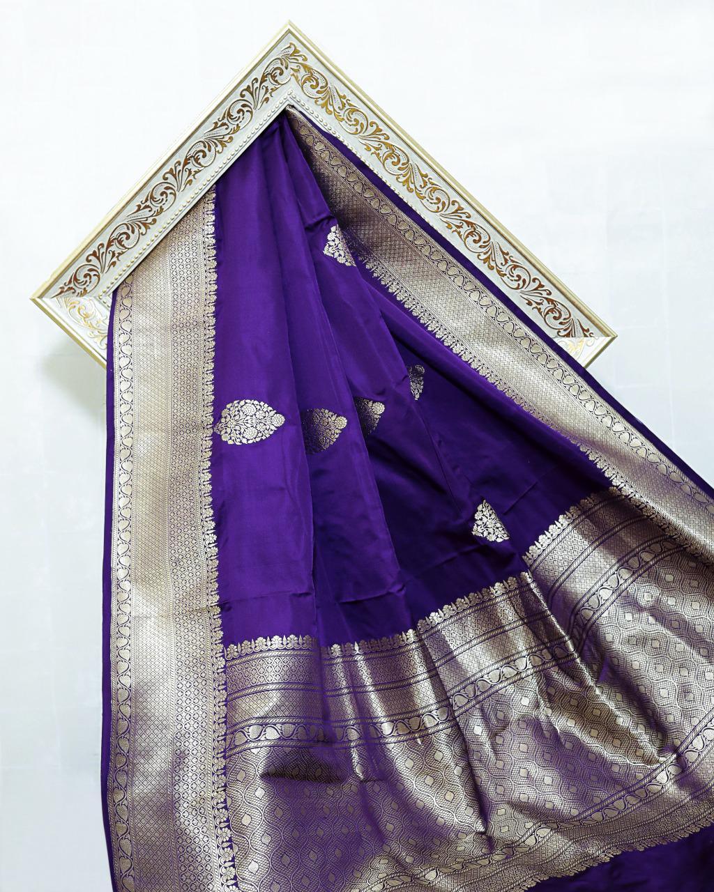 Banarasi Katan portrays a distinctive look, is light in weight, and is apt for all gatherings around the corner. The silky-smooth texture of Banarasi Satin Katan Silk is sure to augment your desire to look gorgeous. Violet Kadhwa Handloom Saree with antique zari weaving. The beauty that this banarasi hand-woven saree portrays is breathtaking.